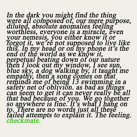 In the dark you might find the thing were all composed of, our mere purpose, diluted, absolute anomalies feeling worthless, everyone is a miracle, even your nemesis, you either know it or forgot it, we’re not supposed to live like this. In my head or on my phone it’s the end of the world as we know it, perpetual beating down of our nature then I look out my window, I see sun, blue sky, a dog walking by, it taught me empathy, then a song comes on that reminds me of being 13 swimming in a safety net of oblivion. As bad as things can seem to get it can never really be all that bad because of you. We go together so anywhere is fine. It’s what I hang on to. There are no words just all these failed attempts to explain it. The feeling. Checkmate.